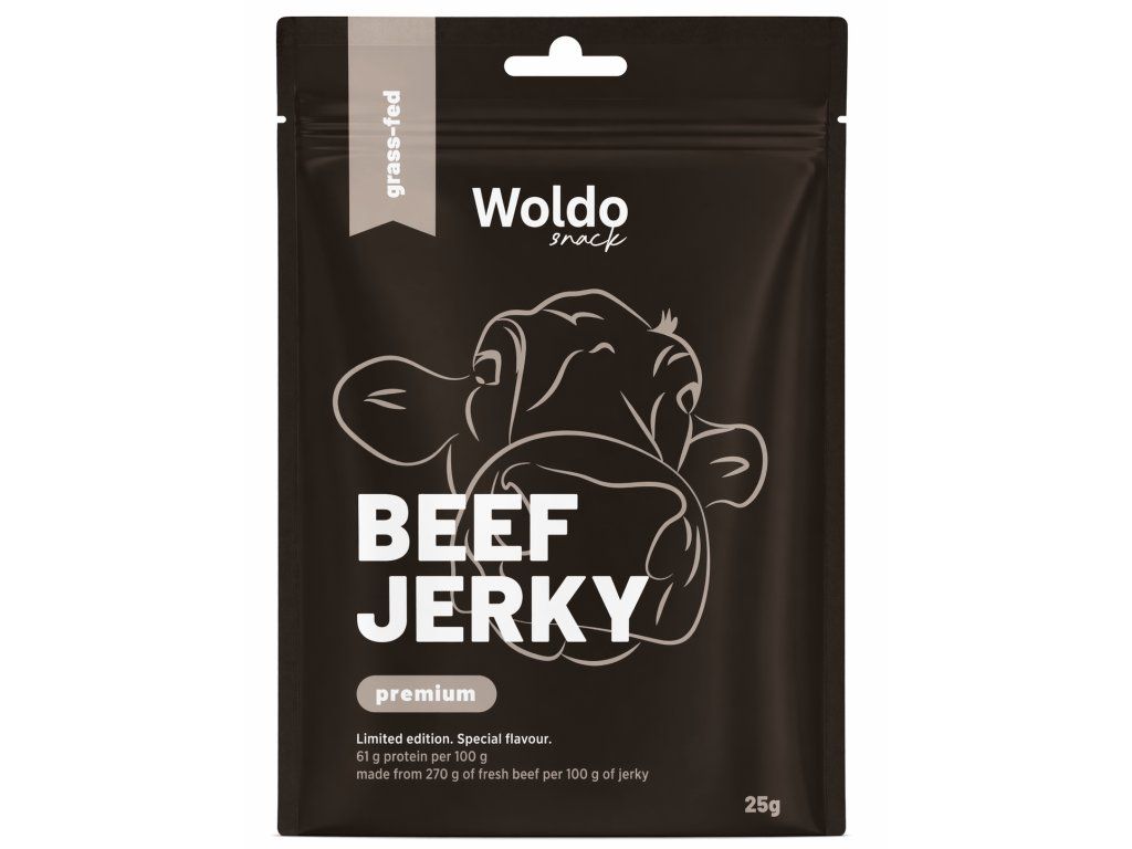 Woldo Snack Beef Jerky – Beef Steak Bar 25 g je praktická masová svačina pro každého, kdo hledá výraznou chuť, vysoký obsah bílkovin a pohodlné balení na cesty. Na přední etiketě je uvedeno, že jde o produkt z grass-fed hovězího masa, tedy z masa skotu krmeného trávou.