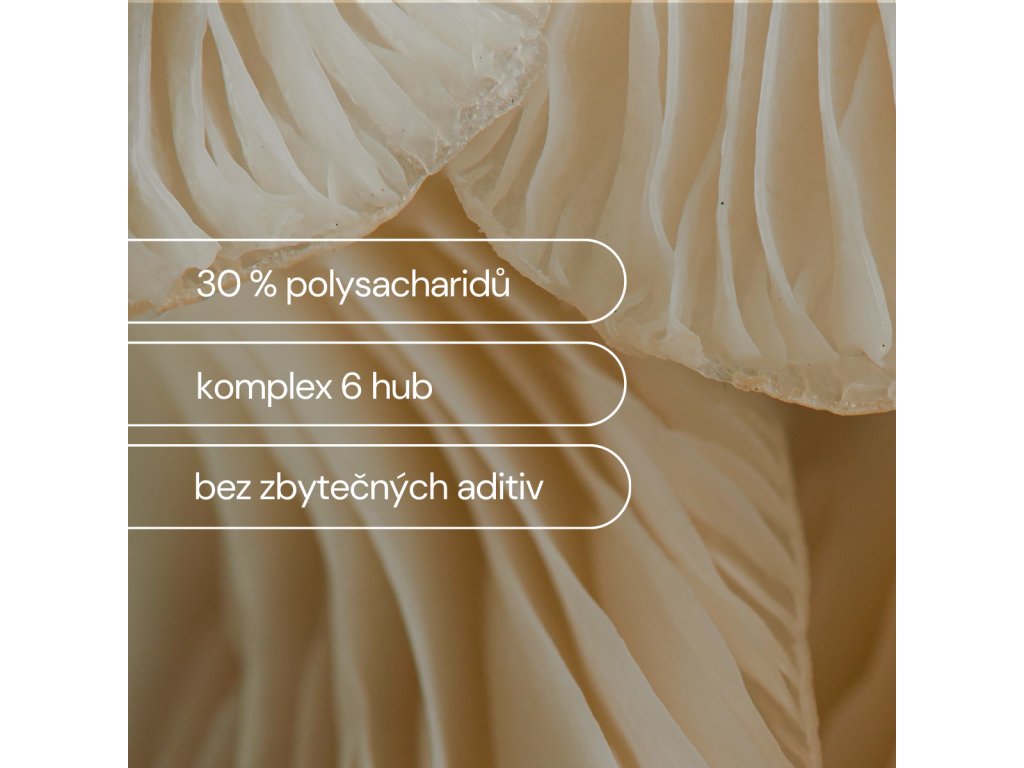 Přísady: Cordyceps extrakt (30 % polysacharidů), Reishi extrakt (30 % polysacharidů), Chaga extrakt (30 % polysacharidů), Hericium extrakt (30 % polysacharidů), Shiitake extrakt (30 % polysacharidů) a Maitake extrakt (30 % polysacharidů)