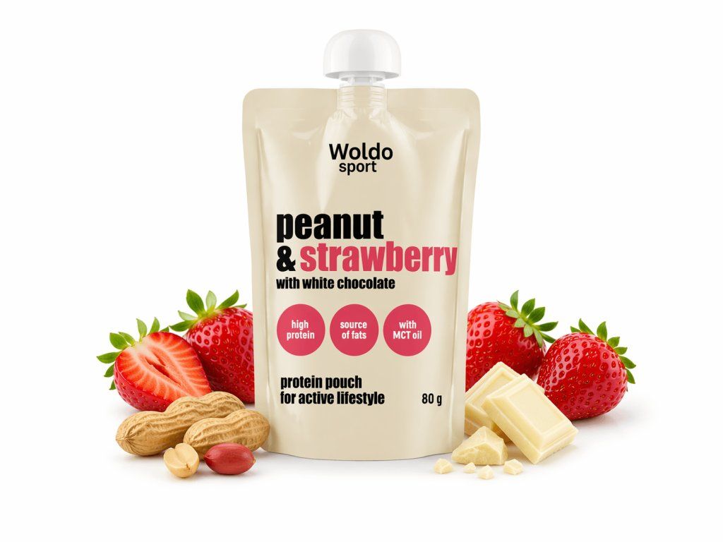 Woldo Sport Peanut & Strawberry with White Chocolate je praktická proteinová kapsička pro aktivní životní styl, která spojuje arašídy, lyofilizované jahody, bílou belgickou čokoládu, syrovátkovou bílkovinu a MCT olej. Výsledkem je jemná a výrazná chuť, praktická forma a rychlá svačina připravená k okamžité konzumaci.