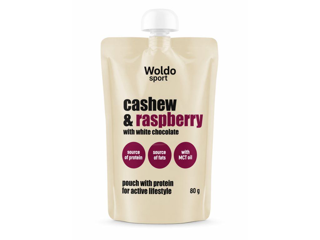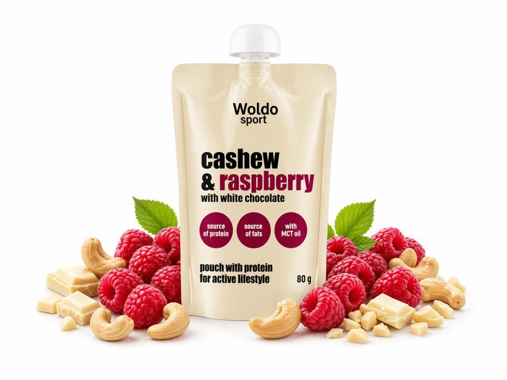 Woldo Sport Cashew & Raspberry with White Chocolate je praktická proteinová kapsička pro aktivní životní styl, která spojuje kešu ořechy, lyofilizované maliny, bílou belgickou čokoládu, syrovátkovou bílkovinu a MCT olej. Výsledkem je jemná krémová chuť s ovocným tónem a pohodlná svačina připravená k okamžité konzumaci.