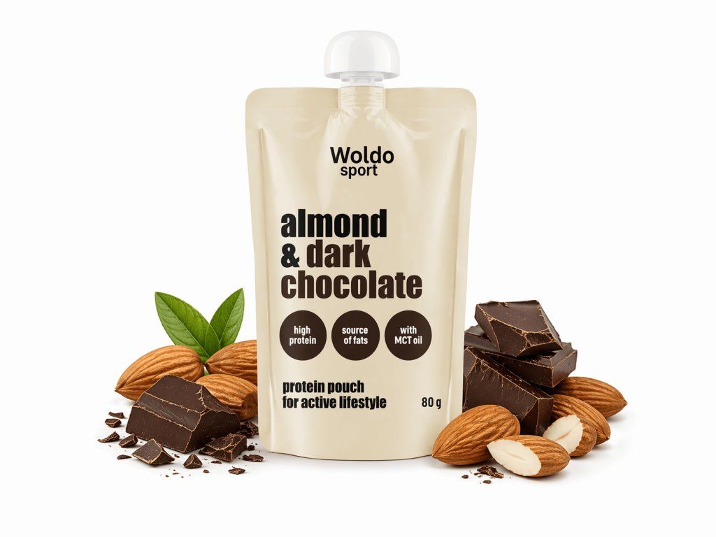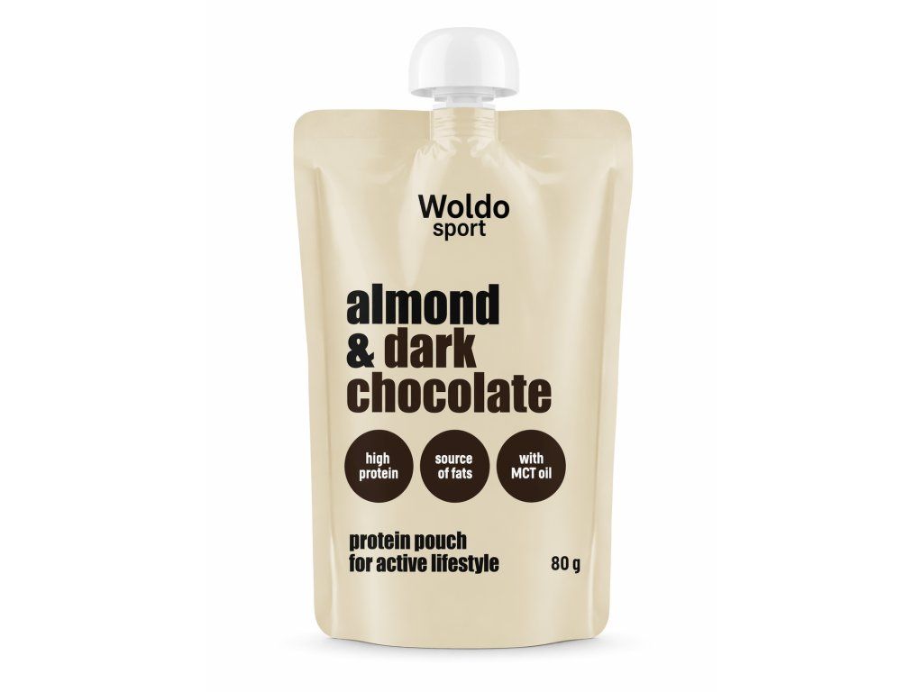 Woldo Sport Almond & Dark Chocolate je praktická proteinová kapsička pro aktivní životní styl, která spojuje mandle, hořkou čokoládu, syrovátkovou bílkovinu a MCT olej. Díky tomu nabízí výraznou chuť, krémovou konzistenci a praktické použití kdykoliv během dne.